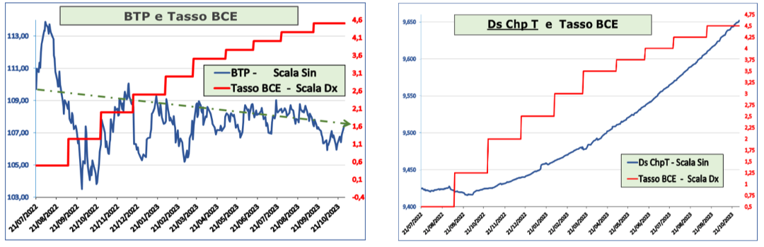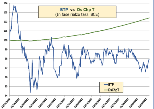 - Ds Chp T dopo una lieve discesa, a seguito dei primi rialzi dei tassi BCE, comincia a salire e si adegua al nuovo scenario e accelera, sempre con oscillazioni impercettibili